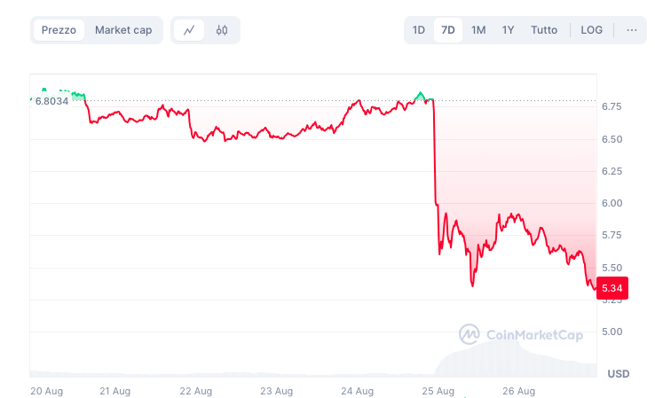 Secondo i dati sui prezzi di crypto.news, TON è stata scambiata sotto i 5,59 $, segnando un calo del 32% rispetto al suo massimo storico registrato a giugno.