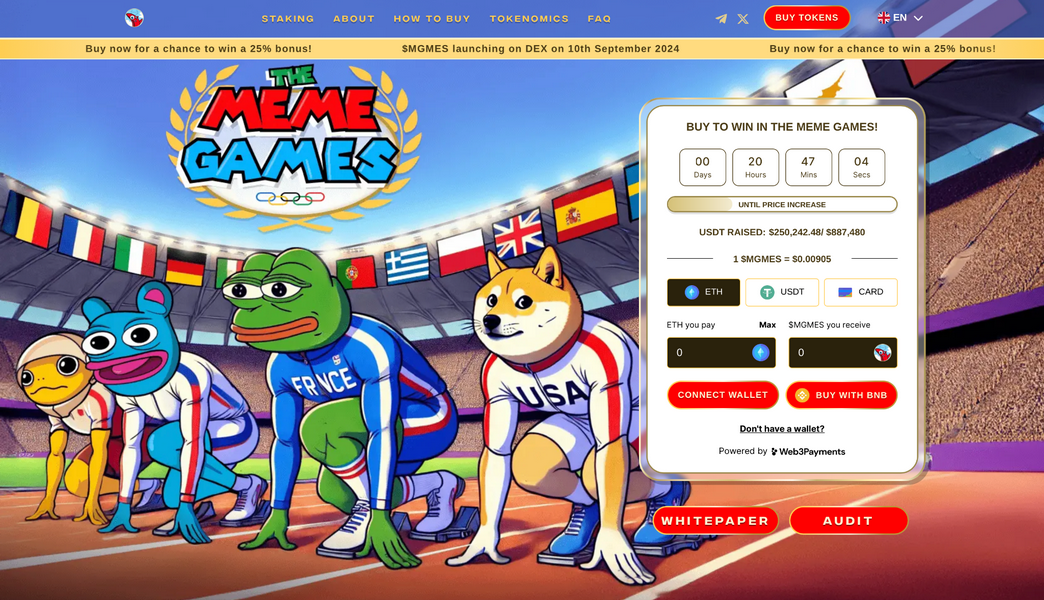 Attualmente, il prezzo di prevendita è di $ 0,00905, ma aumenterà nel corso della campagna, con il prossimo incremento previsto tra due ore. Si dice che The Meme Games sia la meme coin ufficiale delle Olimpiadi con cinque meme coin iconiche: Pepe, Dogecoin, Brett, Turbo e Dogwifhat.