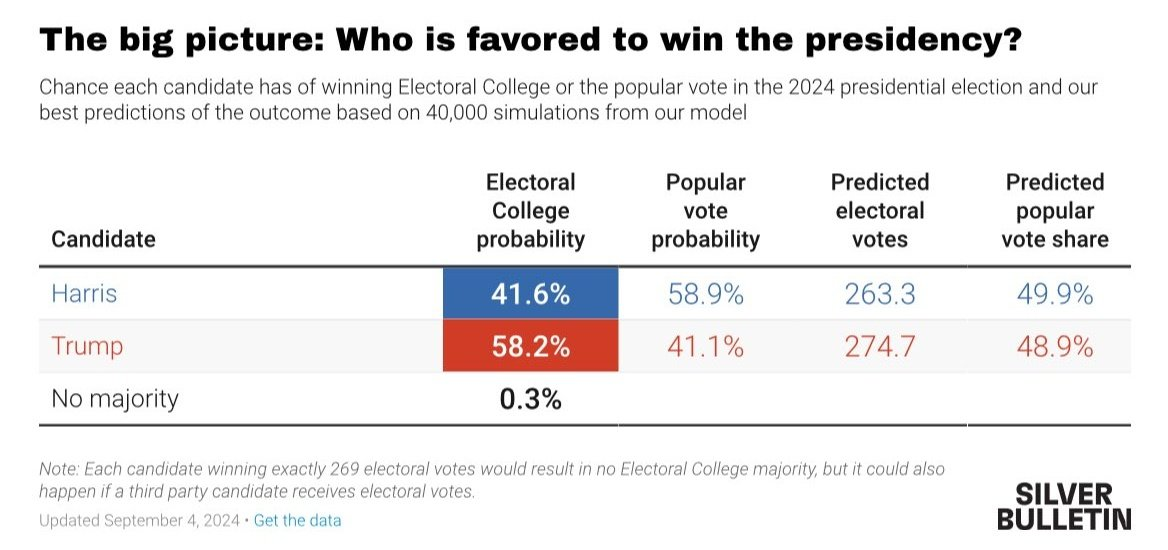 In effetti, Donald Trump è ora il favorito per vincere la Casa Bianca a novembre e precede la vicepresidente Kamala Harris di 16 punti, rivelano i dati del modello di Nate Silver.