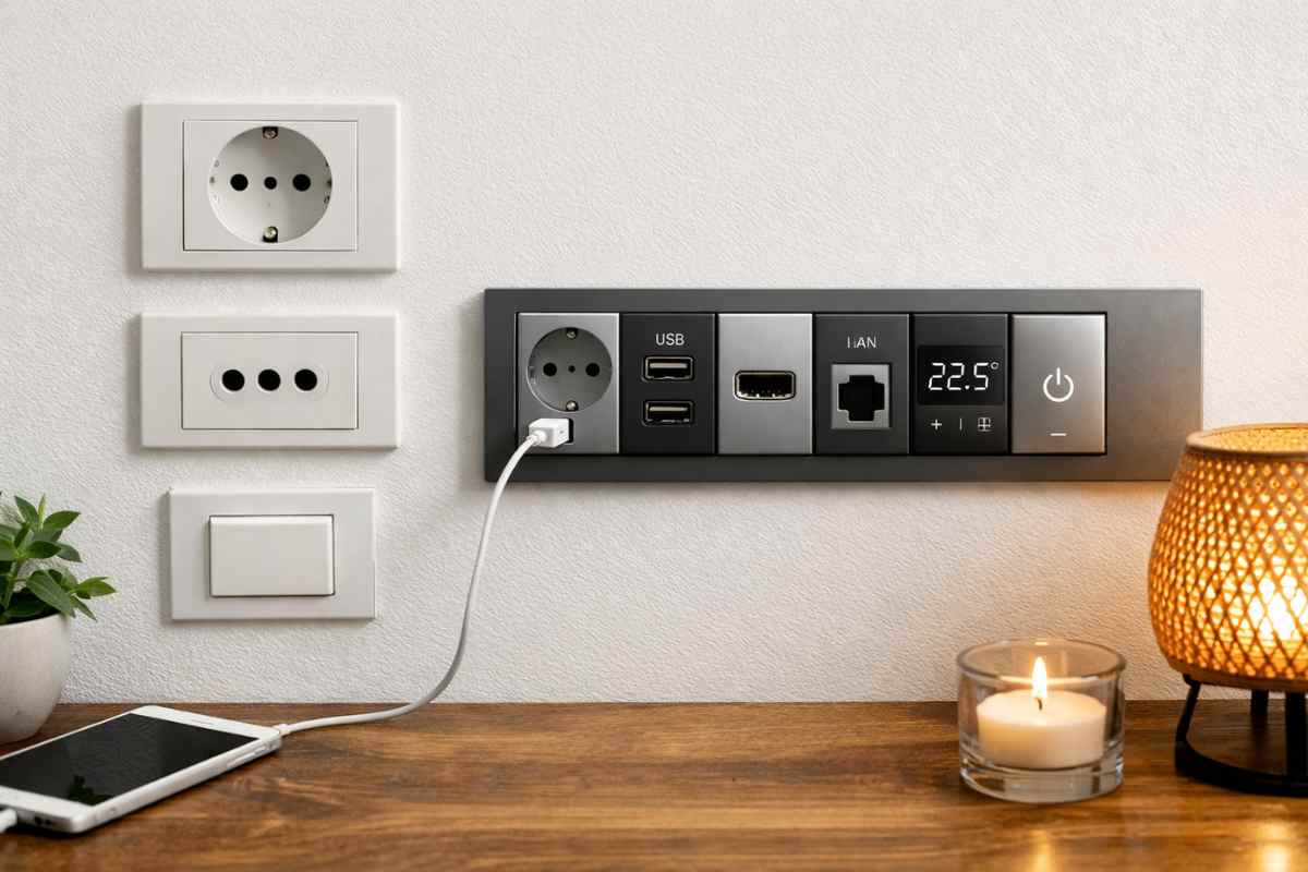 A differenza dei sistemi tradizionali, dove la placca e il supporto vincolano il numero e il tipo di ingressi, la tecnologia modulare si basa su un’architettura a incastro. In Spagna, ad esempio, si registra una diffusione accelerata di questi sistemi, ma anche in Svizzera, trainata dalla necessità di integrare non solo la classica alimentazione elettrica, ma anche connettori USB-C di ultima generazione, porte RJ45 per la fibra ottica domestica e persino moduli per il controllo domotico nello spazio di un unico alloggiamento. Ovviamente è chiaro che questo è il destino di tutta Europa, Italia compresa.