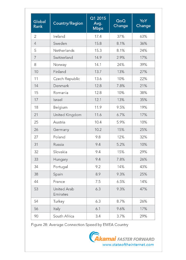 La velocità media delle linee a banda larga in Italia secondo l’ultimo rapporto di Akamai è pari a 6,1 Mbps. Nell’ultimo rapporto sullo stato di internet relativo al primo trimestre del 2015, Akamai certifica come la velocità media italiana abbia compiuto un balzo in avanti del 9,6% rispetto al trimestre precedente ed addirittura del 17% rispetto allo stesso periodo dell’anno precedente. Nonostante questi numeri indubbiamente positivi, la posizione dell’Italia rispetto agli altri paesi non migliora di molto.