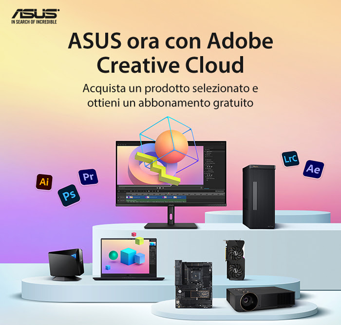 - Abbonamento di un mese: acquistando un notebook , un monitor, una scheda madre, una scheda video o un’unità ottica ASUS idonei*, potrai usufruire di un mese di abbonamento gratuito alla suite completa Adobe Creative Cloud.