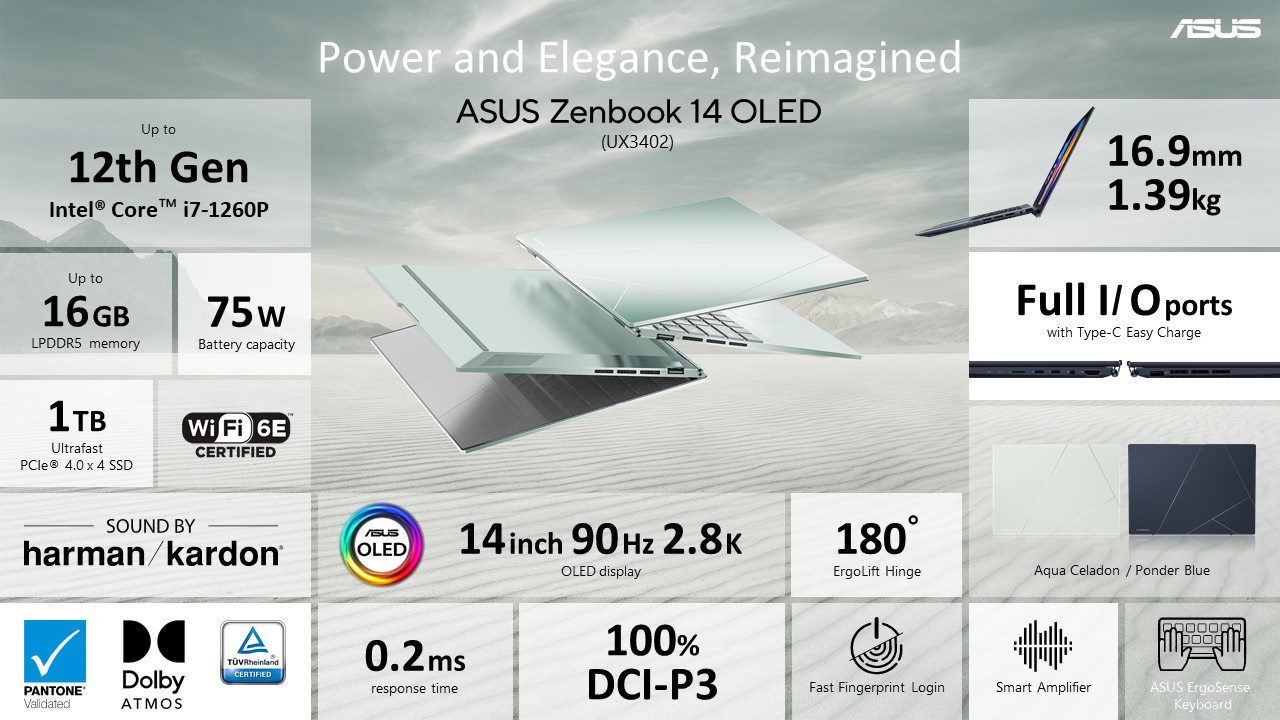 L’azienda ha così progettato lo Zenbook 14X OLED Space Edition molto speciale per commemorare il passato e continuare a esplorare oltre i limiti e andare alla ricerca dell’incredibile. Caratterizzato da esclusivi dettagli di design a tema spaziale sul coperchio e sull’area del poggiapolsi e rifinito in uno speciale colore Zero-G Titanium, Zenbook 14X OLED Space Edition celebra una pietra miliare nella storia dei laptop ASUS. Dulics in fundo il nuovissimo Zenbook 14 OLED, un laptop da 14 pollici potente, elegante e leggero, dotato di una batteria da 75 Wh ad alta capacità di lunga durata, che introduce un aspetto completamente nuovo e moderno alla pionieristica serie Zenbook. Disponibile con processore Intel Core i7 serie P di dodicesima generazione (UX3402) o modelli di processori AMD Ryzen serie 5000 per il 2022 (UM3402), è il nuovo punto di riferimento per la perfezione portatile. Lo Zenbook 14 OLED (UX3402) soddisfa anche i requisiti del laptop Evo.