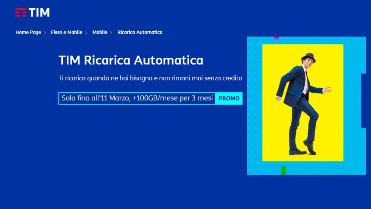 Nuova promo da TIM, che a chi attiva TIM Ricarica Automatica entro l’11 Marzo 2022 (salvo eventuali proroghe o cambiamenti) regalerà per tre mesi 100 Giga di traffico dati ogni trenta giorni.