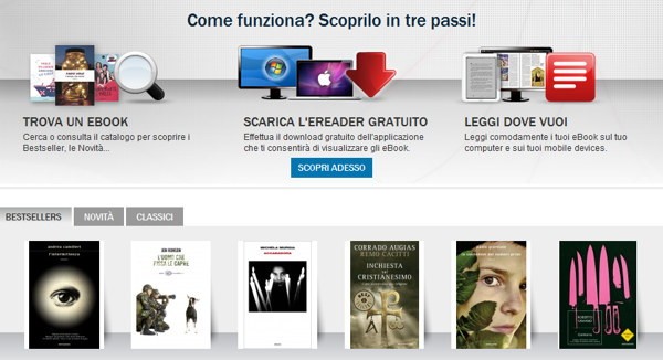 «Telecom Italia e il Gruppo Mondadori hanno siglato oggi a Francoforte, alla presenza dell’Amministratore Delegato di Telecom Italia Franco Bernabè e del Vice Presidente e Amministratore Delegato del Gruppo Mondadori Maurizio Costa, un accordo per la distribuzione dei libri digitali». Grazie a questa intesa parte oggi Bibletstore, la prima libreria digitale italiana con oltre 1.200 titoli della casa editrice di Segrate. Secondo quanto annunciato i titoli Mondadori, Einaudi, Sperling & Kupfer e Piemme giungeranno sullo store con 800 titoli di catalogo e 400 novità edite in contemporanea tanto su cartaceo quanto in digitale.