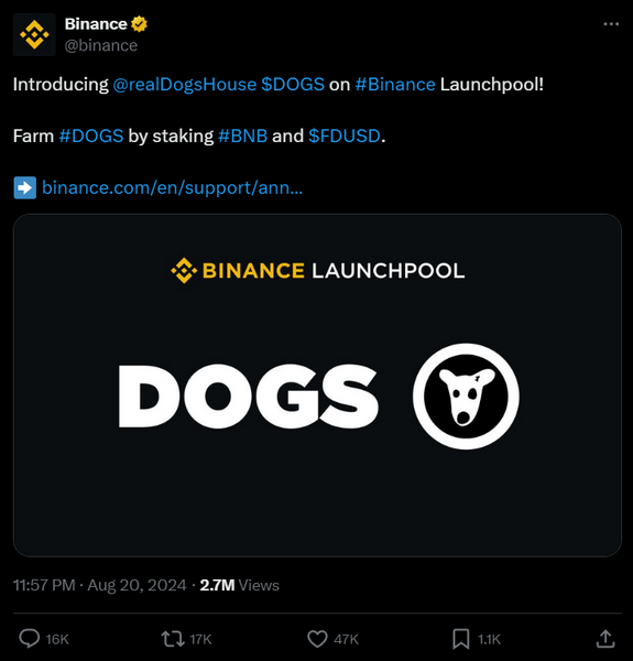 La meme coin verrà lanciata anche su Binance Launchpool, consentendo agli investitori di mettere in staking le proprie crypto BNB o FDUSD per coltivare token DOGS.
