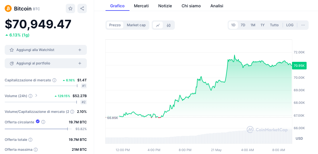 Venerdì Bitcoin era salito brevemente sopra i 70.000 dollari in un trading volatile mentre la frenesia cripto continua ad affascinare la comunità degli investitori. È salito fino a $ 70.275 prima di scendere rapidamente a $ 69.317,72. Da allora, BTC è rimasto a circa 69.800 dollari.