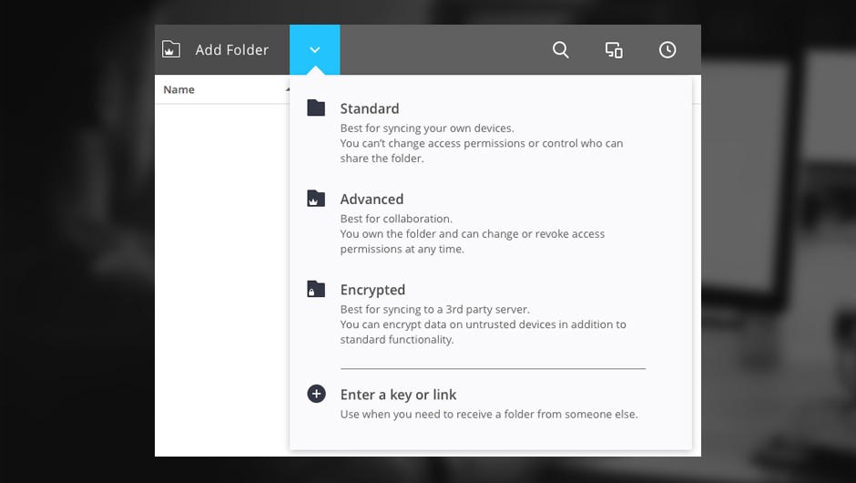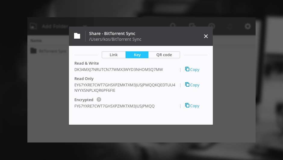 Sync è stato sviluppato originariamente per consentire la condivisione e la sincronizzazione dei file tra più dispositivi, sfruttando la tecnologia P2P di BitTorrent, invece dei vari servizi di cloud storage. Grazie alle Encrypted Folder, estensione delle tradizionali cartelle (standard e advanced), è possibile usare piattaforme di terze parti in totale sicurezza. Quando l’utente crea una cartella cifrata, Sync genera tre tipi di chiavi crittografiche: Read-Write, Read-Only e Encrypted. La prima permette di accedere e modificare i contenuti delle cartelle, la seconda di accedere ai file solo in lettura, mentre la terza solo di ricevere i file. La Encrypted key (AES a 128 bit) può essere utilizzata, ad esempio, per un backup sul cloud.