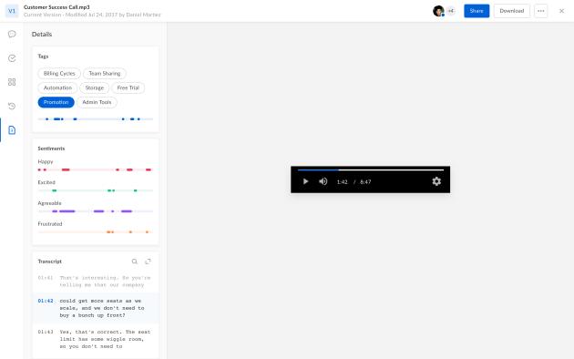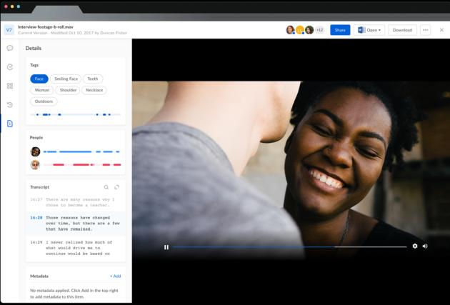 Image Intelligence effettua l’analisi delle immagini durante l’upload per identificare gli oggetti e riconoscere il testo. Le informazioni ottenute diventano etichette (tag) che verranno mostrate nell’anteprima e indicizzate per la ricerca. Audio Intelligence effettua invece la trascrizione dell’audio, creando etichette che semplificano la ricerca del file. Video Intelligence, infine, trascrive i dialoghi presenti nei video e riconosce i volti delle persone.
