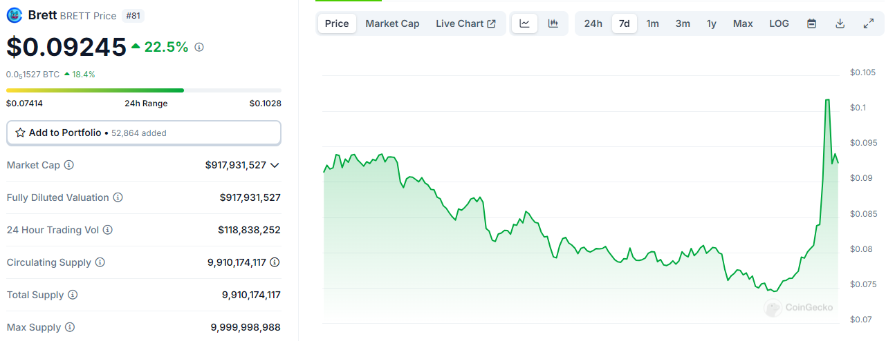 Il prezzo del BRETT ha registrato un rally di quasi il 40% rispetto ai minimi settimanali di 0,74 dollari, per poi essere scambiato fino a 0,102 dollari oggi prima di un marginale pullback. Al momento della stesura di questo articolo, la meme coin Base più importante viene scambiata a $ 0,092.