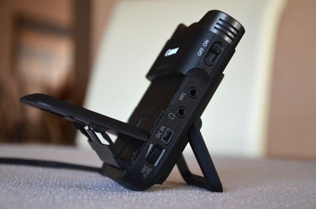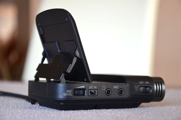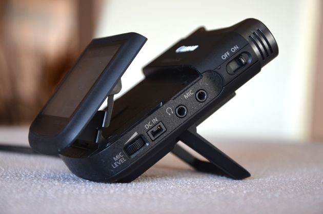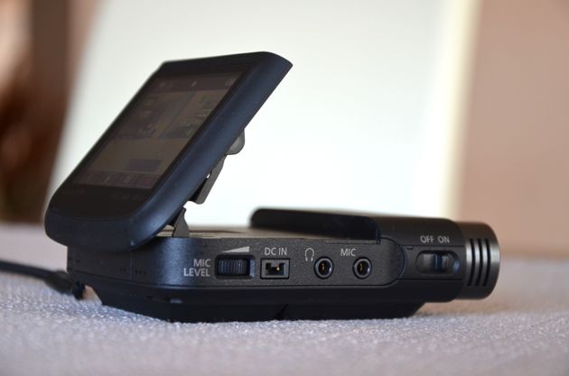 Il comando di avvio delle registrazioni è posizionato intelligentemente nella parte anteriore, laddove le dita devono essere per forza per garantire una impugnatura salda del device; la parte restante dei comandi è disponibile sul display touchscreen, sul quale lasciare inevitabilmente innumerevoli segni di impronta digitale. Disponibili sul lato destro anche lo spazio per un auricolare e un microfono, il che ben fotografa il particolare contesto della videocamera per un utilizzo da primo piano per interviste o “selfie" da caricare online.