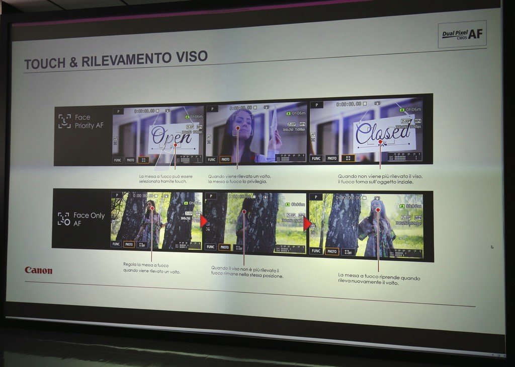 Questa slide, proiettata durante la presentazione, mostra le sofisticate funzioni di rilevamento viso