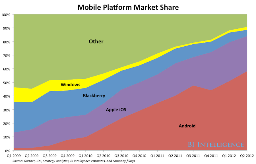 I guai, spiega Blodget, matureranno definitivamente nel momento in cui dal mercato dei device si inizierà a ragionare su di una nuova dimensione, considerando appieno quelli che sono invece gli equilibri tra le piattaforme. Perché alla fine dei conti sarà il rapporto di forza tra le piattaforme a dettare le regole del mercato. Dopo decenni di “Wintel”, infatti, Apple ha scavato una crepa nell’universo Microsoft ed Android si è infilato. Dilagando. Oggi Apple si trova però con una quota di mercato poco più ampia rispetto agli anni passati, ma poco più: Android ha avuto performance e risultati ben più ampi e nel frattempo anche gli attori minori del mobile iniziano ad alzare la voce per pretendere indietro le quote perdute in passato. Microsoft in primis.