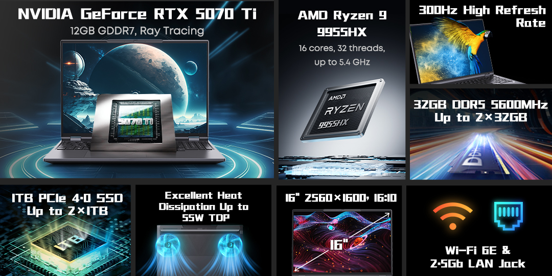 CHUWI abbina questa CPU top di gamma alla NVIDIA GeForce RTX 5070 Ti Laptop GPU, dotata di 12GB di VRAM GDDR7 e tecnologia DLSS 4. Basata sull’architettura Blackwell RTX, supporta ray tracing completo e raggiunge performance straordinarie: fino a 191 FPS a 1440p e 149 FPS in 4K nei titoli più pesanti come Cyberpunk 2077 o Alan Wake 2.