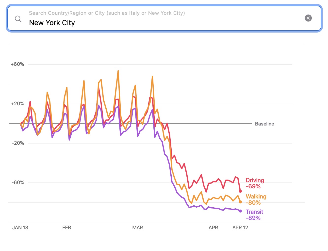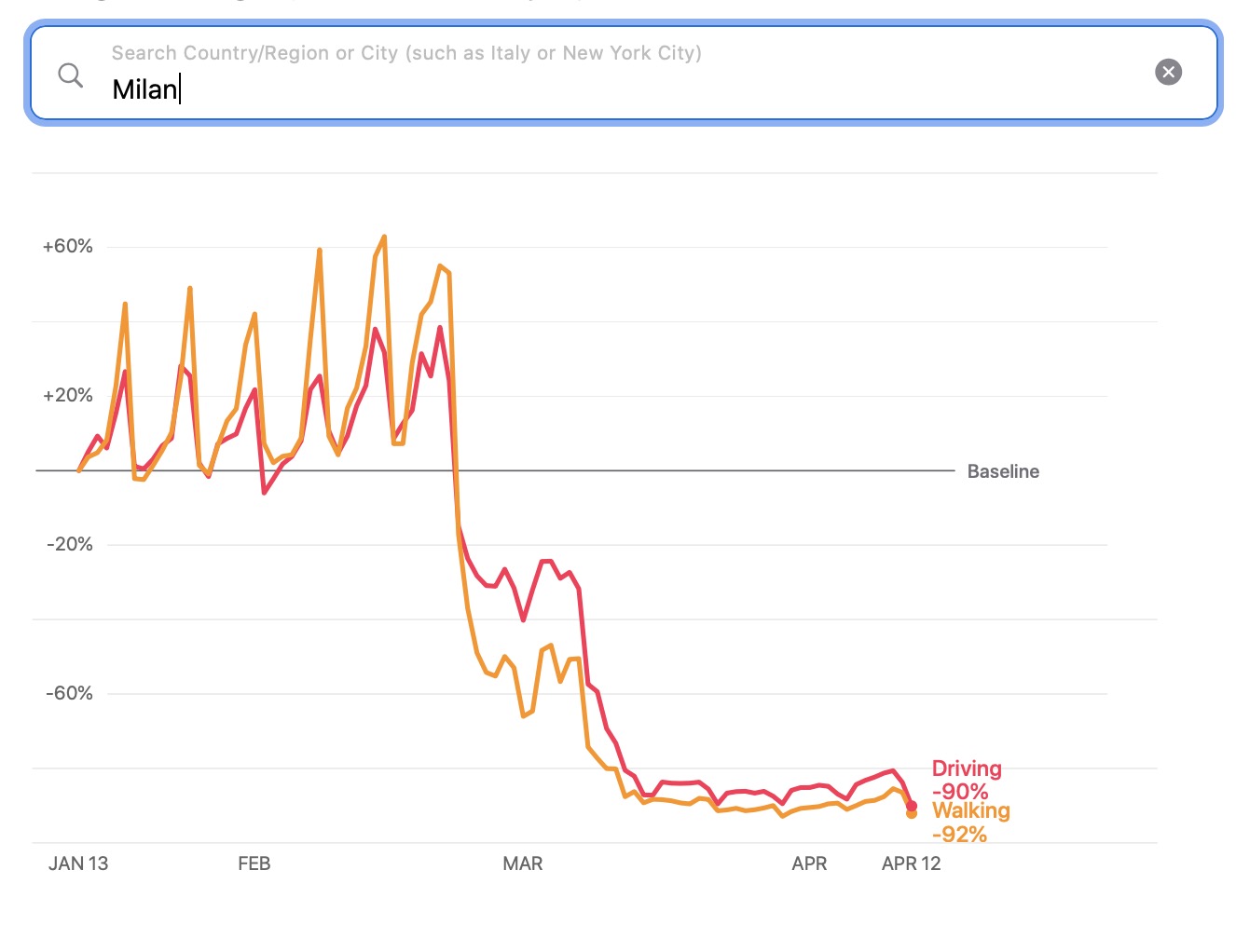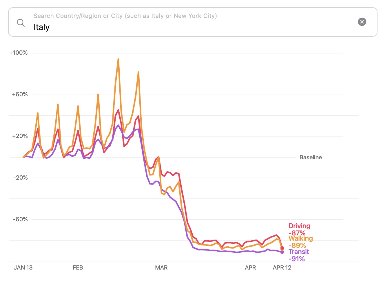 Oltre a permetterci di controllare l’andamento della mobilità Paese per Paese, ma anche città per città, lo strumento di Apple ci fornisce anche un confronto tra Paesi: se in Italia la mobilità si è complessivamente ridotta dell’87% rispetto alla media, in Germania il calo è stato soltanto del 54%, mentre negli Stati Uniti la riduzione è stata del 63%.