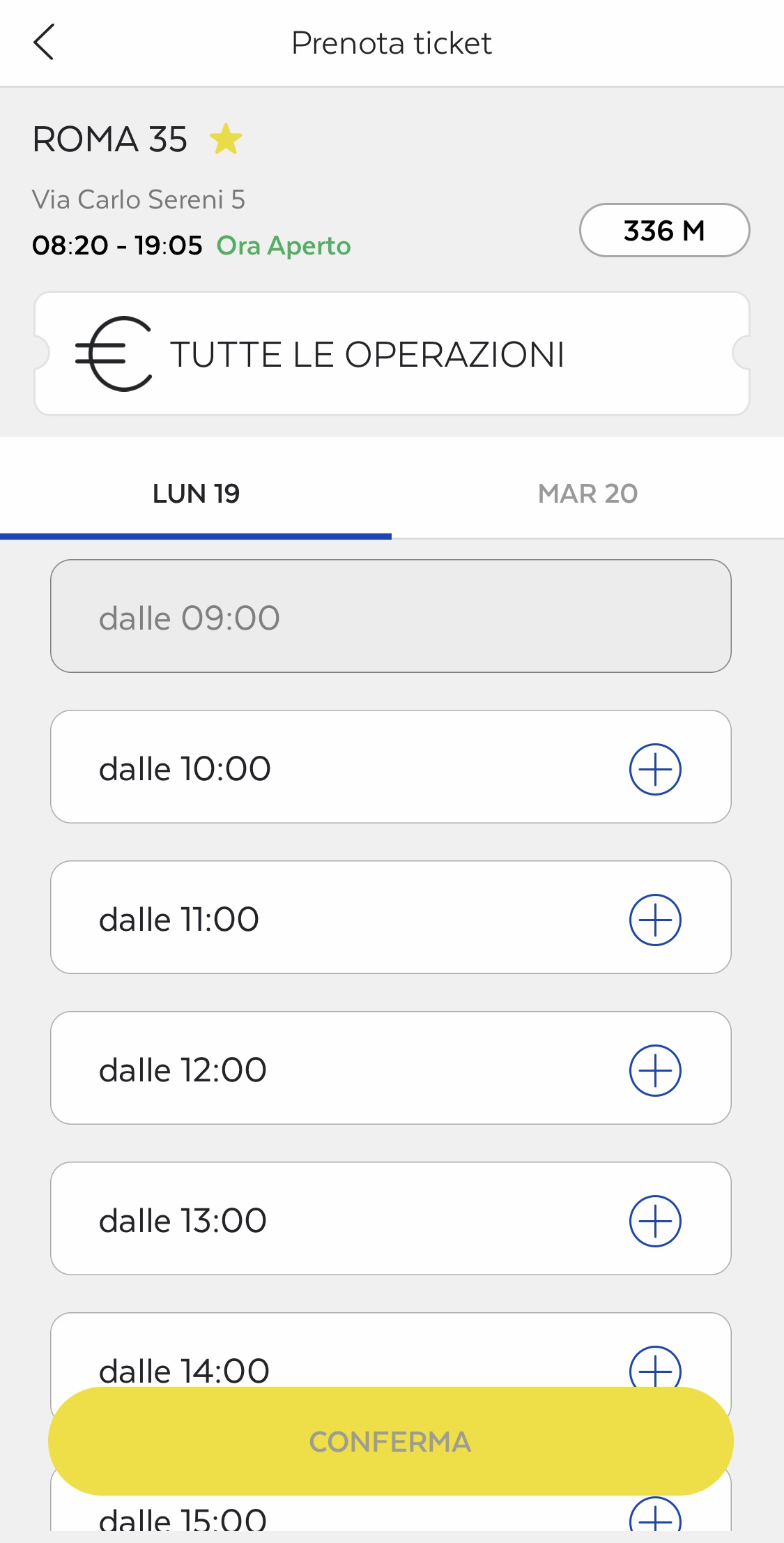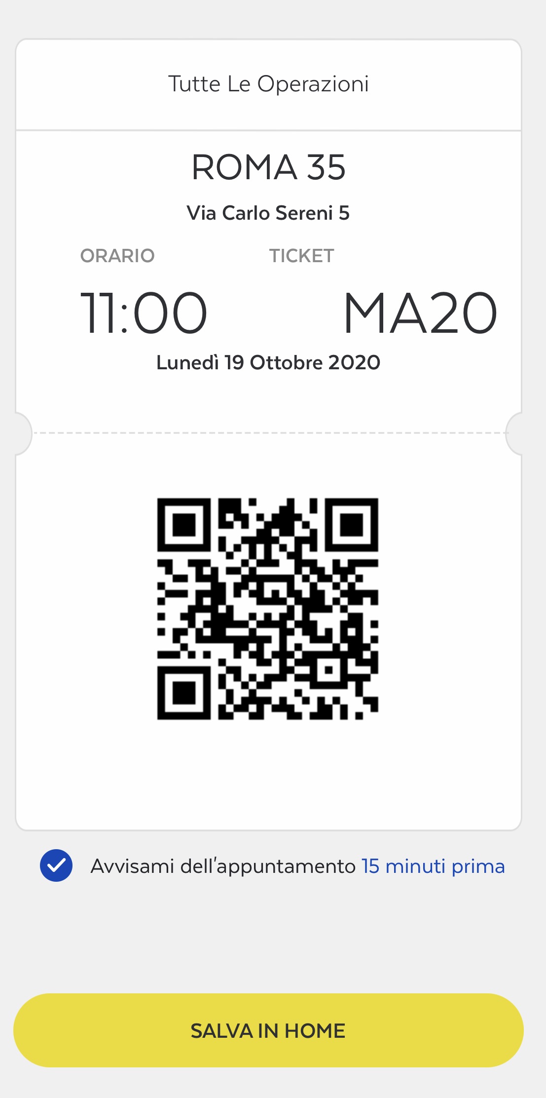 Dopo aver fatto un tap su Procedi vi troverete davanti le fasce orarie disponibili tra le quali scegliere il momento più adatto per voi. Selezionate l’orario che preferite e fate un tap su Conferma. L’app vi presenterà un ticket digitale con QR Code che, una volta giunti all’ufficio postale nell’orario indicato, dovrete scansione sull’apposito lettore posizionato all’ingresso (lo stesso che emette i bigliettini con numerazione progressiva).