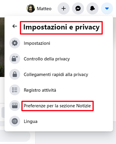 - Selezionare Impostazioni e privacy, poi Preferenze per la sezione Notizie