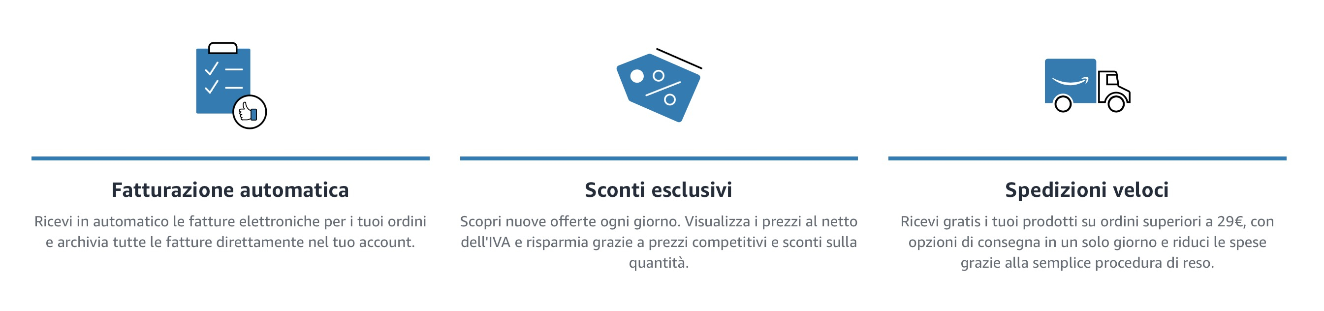 Se possiedi un’azienda o sei un libero professionista che lavora in regime di partita IVA, ti rammentiamo che per te è disponibile Amazon Business, il portale con tutte le offerte Amazon scorporate dall’IVA che semplifica la richiesta dei documenti fiscali e fornisce servizi specifici per aziende e titolari di partita IVA.