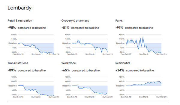 Tra i 131 paesi si annovera anche l’Italia, dove pare che la quarantena sia rispettata quasi da tutti. Si segnala infatti un -94% di individui nei negozi e nei locali, un -90% nei parchi e un -85% negli alimentari o nelle farmacie. La grande flessione è stata registrata anche nei trasporti: l’87% di persone in meno ha preso metropolitane e bus, e gli spostamenti casa-lavoro sono calati del 63%. Di conseguenza è aumentata la percentuale relativa allo stare in casa, che segna un +24%. Il documento osserva anche i risultati divisi per ogni regione, che riflettono un comportamento più o meno uniforme dei cittadini in tutta Italia (non soltanto nel Nord, più colpito).