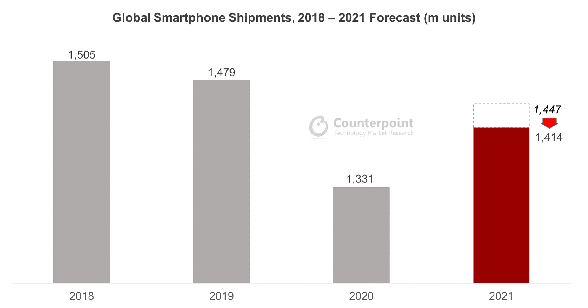 Counterpoint Research, una delle più note società globali di ricerche sui mercati tecnologici ai livelli C dell’industria mobile, ha pubblicato i dati di una sua indagine secondo la quale nel 2021 verranno spediti quasi 50 milioni di smartphone in meno rispetto alle stime precedenti, allontanando di fatto il settore dai risultati del 2019, quando erano stati inviati 1,479 miliardi di unità. Questo potrebbe tra l’altro tradursi, oltre ovviamente in un calo di approvvigionamento generale di telefonini, anche in una ulteriore carenza di prodotti in particolari Paesi, visto che i grandi marchi del settore pare stiano già definendo le “priorità” di distribuzione sul mercato per area geografica.