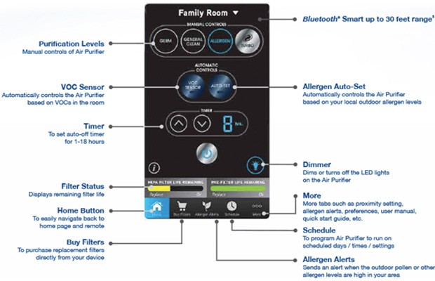 Il funzionamento è presto spiegato: oltre a funzionare come tutti gli altri prodotti di questo tipo, ovvero depurando l’aria di una stanza trattenendo gli allergeni in un apposito filtro HEPA (High Efficiency Particulate Air), può connettersi a Internet attraverso il dispositivo mobile per consultare report aggiornati sulla zona. Nel caso in cui siano rilevate percentuali molto alte di polline, o altri elementi potenzialmente dannosi per chi è allergico, l’utente viene avvisato con un messaggio e di conseguenza può incrementarne l’efficacia. Sono presenti anche un pannello di controllo posizionato nella parte superiore e un sensore VOC per il monitoraggio automatico della qualità dell’aria.
