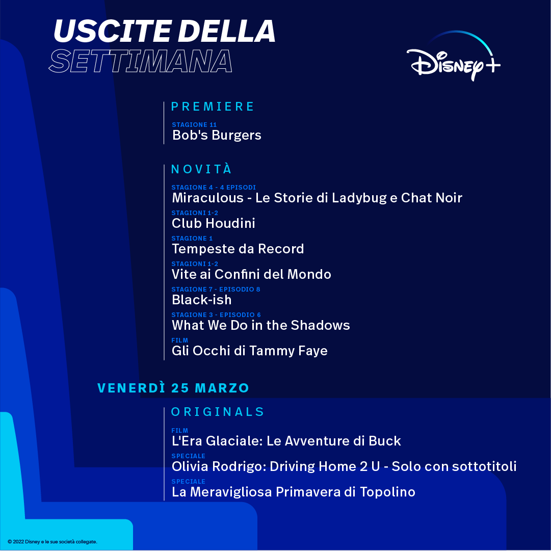 Venerdì 25 marzo poi arriverà il film de L’Era Glaciale: Le Avventure di Buck, lo speciale su Olivia Rodrigo dal titolo Driving Home 2 U e la Meravigliosa Primavera di Topolino, tutte produzioni atte a omaggiare l’arrivo della nuova stagione.