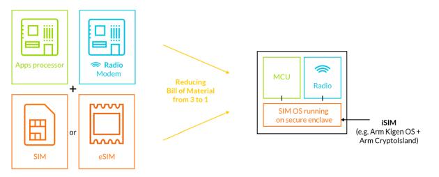 Un anno fa, la GSMA ha annunciato le specifiche della embedded SIM (eSIM), una scheda programmabile che permette di cambiare facilmente operatore, senza spostare fisicamente la card, oppure usare lo stesso abbonamento per diversi dispositivi. Il chip misura 6×5 millimetri e oggi viene usato soprattutto negli smartwatch. La iSIM (integrated SIM) di ARM occupa uno spazio ancora minore, essendo integrata nel SoC, accanto alla CPU e al modem. La soluzione è basata sul software Kigen OS che rispetta le specifiche eUICC della GSMA. La sicurezza è invece garantita dalla tecnologia ARM CryptoIsland.