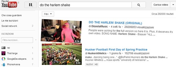 Dopo aver conquistato Google e Facebook, il fenomeno Harlem Shake si impossessa anche di YouTube. Nel fine settimana è stato scovato un simpatico e bizzarro easter egg sulle pagine del portale di video sharing: basta digitare “do the harlem shake” come chiave di ricerca per vedere la pagina dei risultati prendere letteralmente vita e i filmati muoversi in modo compulsivo.