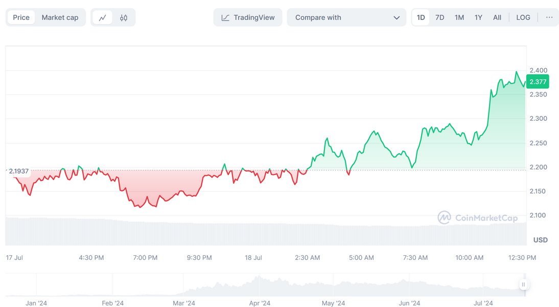 Il token ha avuto un’ottima performance settimanale, crescendo complessivamente del 42,07% nell’ultima settimana. Con una capitalizzazione di mercato di 2.378.866.192 dollari, è stata una settimana fantastica per la quarta meme coin più grande del mondo.