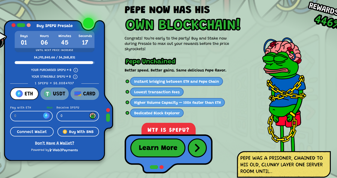 Pepe Unchained (PEPU) è una delle più grandi ICO di meme coin di quest’estate, avendo raccolto finora oltre 4,1 milioni di dollari in prevendita.