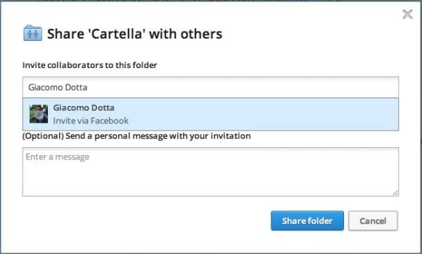 Per poter accedere a tale feature è sufficiente collegarsi alla pagina Share, tipicamente utilizzata per configurare le cartelle condivise, e seguire il tradizionale processo per l’abilitazione di altri utenti alla visualizzazione del contenuto di una specifica directory. Durante la scelta delle persone cui inviare l’invito compare adesso un nuovo pulsante con il quale è possibile collegare il proprio account Dropbox con un profilo Facebook ed una volta terminata la fase di integrazione sarà sufficiente digitare un nome nell’apposito campo per ottenere suggerimenti provenienti dalla propria lista di amici.