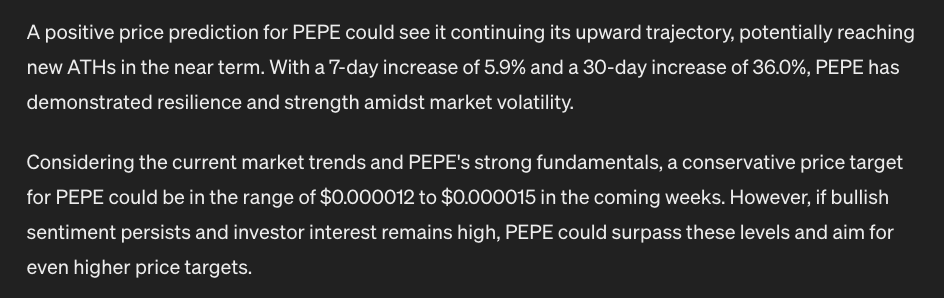 L’analisi dell’intelligenza artificiale non si è fermata a Dogecoin. ChatGPT-4o ha anche offerto le sue previsioni per un’altra meme coin iconica: Pepe (PEPE).