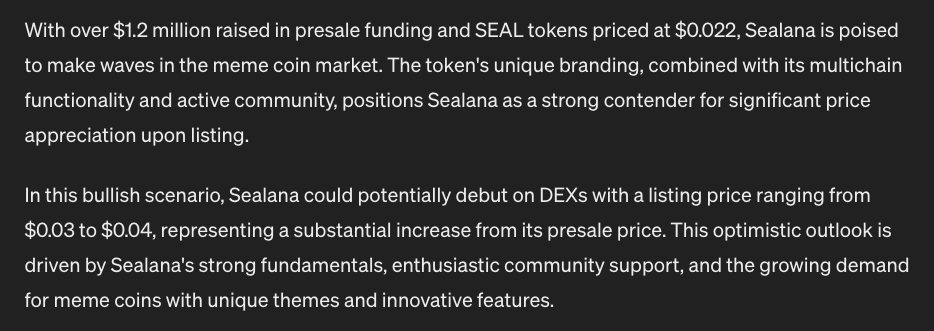 Un altro nuovo arrivato sul mercato che ha ricevuto ottime considerazioni da ChatGPT-4o è Sealana (SEAL), un bizzarro progetto su Solana che raffigura una foca in sovrappeso.