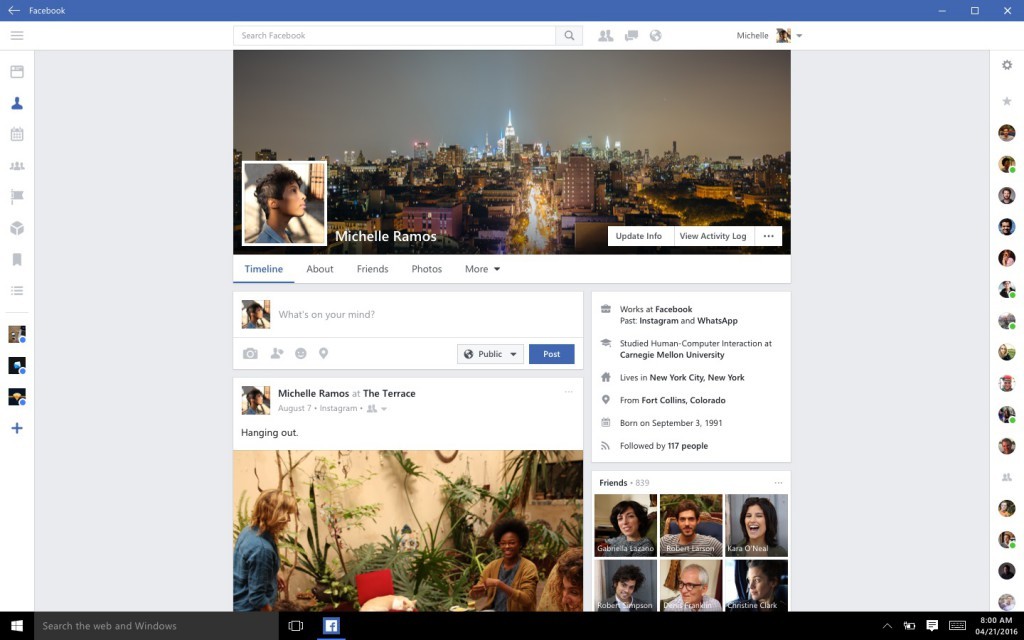 Facebook per Windows 10 è stata riscritta con l’obiettivo di migliorare le prestazioni e includere tutte le funzionalità disponibili sul web e sulle app mobile. L’utente noterà subito una maggiore velocità di avvio rispetto alle precedente versione per Windows 8 (che può essere ancora usata). L’interfaccia visualizza il news feed al centro dello schermo, accanto alla colonna che elenca eventi, compleanni e le news più popolari. Nella parte superiore sono visibili la barra delle ricerche e le icone per richieste di amicizia, messaggi e notifiche, mentre a sinistra sono presenti i collegamenti per l’accesso alle varie sezioni del social network.