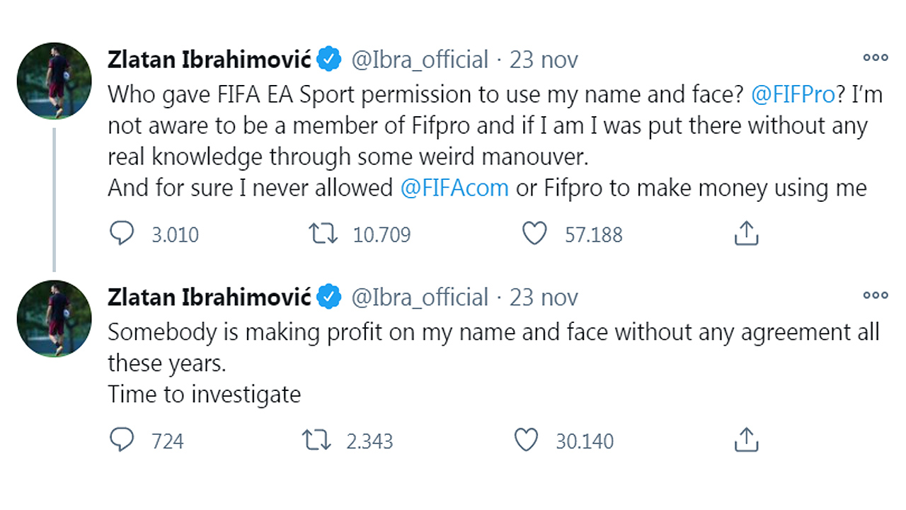 “Chi ha dato a FIFA EA Sport il permesso di usare il mio nome e la mia faccia?”, si legge infatti in un tweet sull’account ufficiale di Ibra. “FIFPro? Non mi risulta di essere un membro di Fifpro e se lo sono, sono stato messo lì senza saperlo, attraverso qualche strana manovra. E di sicuro non ho mai permesso a FIFA o FIFPro di fare soldi usando me. Qualcuno, da anni, sta facendo profitto sul mio nome e sulla mia faccia senza alcun accordo. È ora di indagare”.