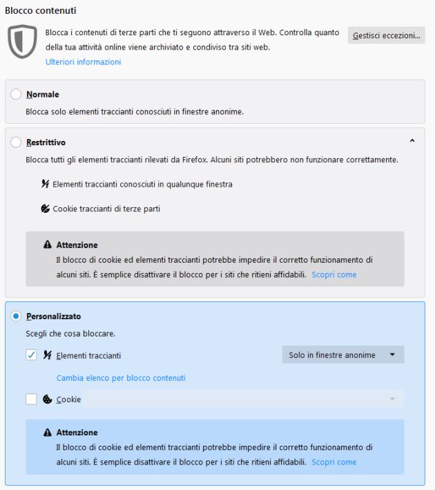 Ci sono due modi per accedere alla sezione. Si può cliccare sull’icona a forma di ingranaggio accanto alla voce Blocco contenuti (dopo aver cliccato la i nella barra degli indirizzi) oppure sulla voce Privacy e sicurezza nelle Opzioni. Scegliendo Normale vengono bloccati solo gli elementi traccianti nelle finestre anonime. In futuro verranno bloccati anche i cookie traccianti di terze parti. L’impostazione Restrittivo blocca invece tutti gli elementi traccianti rilevati da Firefox, ma alcuni siti potrebbero non funzionare correttamente. Infine, scegliendo Personalizzato è possibile avere un controllo maggiore sui tracker e sui cookie da bloccare.