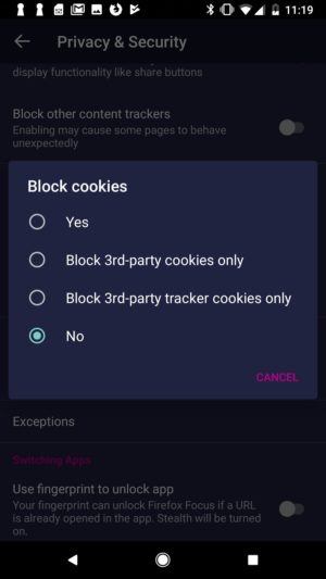 Nelle impostazioni di Firefox Focus è possibile scegliere varie opzioni: blocco di tutti i cookie, nessun blocco, blocco di cookie di terze parti o blocco dei cookie traccianti di terze parti inclusi nelle liste di Disconnect. Quest’ultima, che rappresenta la nuova impostazione predefinita, consente l’uso dei cookie se contribuiscono a migliorare l’esperienza di navigazione, ma blocca il tracciamento cross-site.