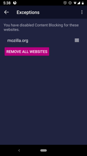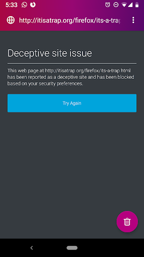 Se il sito non viene visualizzato correttamente è possibile disattivare il blocco aggiungendolo alla whitelist. La ETP, quando attivata, offre anche benefici in termini prestazionali dato che le pagine vengono caricate più velocemente. Altra novità importante per la sicurezza è il supporto per il servizio Safe Browsing aggiunto al motore di rendering GeckoView. Se l’utente visita un sito incluso nella lista di Google, Firefox Focus mostra un avviso di pericolo che può essere seguito o ignorato.