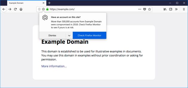 Firefox Monitor permette anche di ricevere un rapporto completo quando si verificano nuova violazioni di dati e suggerimenti per la sicurezza. È sufficiente inserire l’indirizzo email nella schermata che viene mostrata cliccando sul link “Ottieni il tuo rapporto”. Gli utenti Firefox possono ora utilizzare una simile funzionalità direttamente nel browser. Se si visita un sito compromesso negli ultimi 12 mesi viene inviata una notifica, segnalata con una specifica icona (un esagono con la lente di ingrandimento) nella barra degli indirizzi.