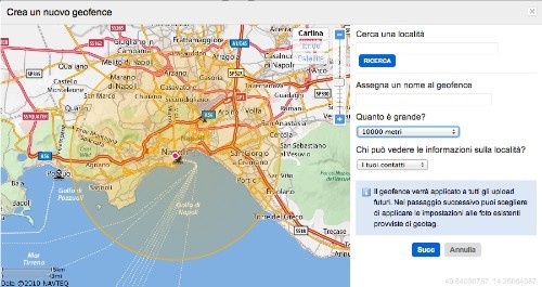 Un geofence rappresenta una zona del globo caratterizzata da particolari impostazioni relativamente alla privacy delle fotografie ivi scattate. La creazione di un nuovo geofence si compone dunque di due fasi: la determinazione dell’area, trascinando l’apposito strumento sulla cartina e specificandone il raggio d’azione, e la specificazione dei parametri che andranno a caratterizzare tutti gli upload di foto realizzate all’interno di tale area. Ogni utente può creare fino a 10 geofence.