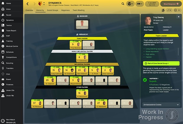 In Football Manager 2018 viene attribuita importanza anche all’armonia di squadra, con la necessità di gestire al meglio i rapporti degli atleti dentro e fuori dal campo per ottenere risultati. Perché, si sa, nel calcio lo spogliatoio conta. Ci sono poi un nuovo centro medico per un’analisi dettagliata degli infortuni ed è stato perfezionato il mercato dei trasferimenti aggiungendovi un tocco in più di realismo con nuove clausole e opzioni per gli ingaggi.