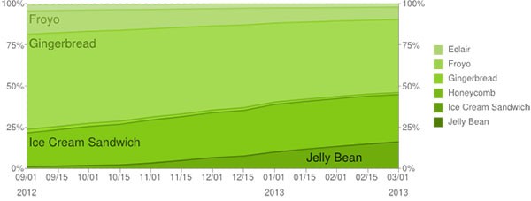 Puntualmente come accade all’inizio di ogni mese, Google rilascia le statistiche ufficiali riguardanti la frammentazione del sistema operativo Android, mostrando la percentuale dei dispositivi che utilizzano le differenti versioni della piattaforma. Rispetto a quanto visto nei primi giorni di febbraio, si nota una lieve crescita della più recente release Jelly Bean, con la precedente Ice Cream Sandwich che perde meno di un punto e Gingerbread ancora saldamente al comando di questa particolare chart.