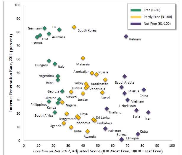 Le brutte notizie riguardano anche altri paesi. In 20 dei 47 presi in considerazione, il livello di libertà si è abbassato. La triste conclusione di questo rapporto è che la libertà di Internet è attualmente in declino a livello mondiale. Hanno pesato sulle statistiche il Bahrein, l’Etiopia, il Pakistan, la Turchia, molto peggiorati rispetto a un anno fa – gli esperti di geopolitica lo considerano un irrigidimento dei governi per effetto della primavera araba, dal cui contagio vogliono restare immuni – e i casi sempre più numerosi e accertati di censura e azioni persecutorie nei confronti di blogger e attivisti in molte parti del globo.
