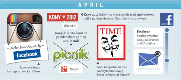 Aprile: Facebook compra Instagram per un miliardo di dollari, Anonymous si guadagna la copertina del Time, esplode il fenomeno Kony.