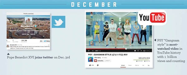 Dicembre 2012: @Pontifex è l’account del Papa su Twitter. GanGnam style diventa il video più cliccato di sempre su YouTube.