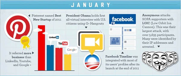 In gennaio Pinterest si guadagna il titolo di migliore startup, Obama si fa intervistare in un hangout di Google+, Anonymous attacca la SOPA e Facebook introduce la Timeline.