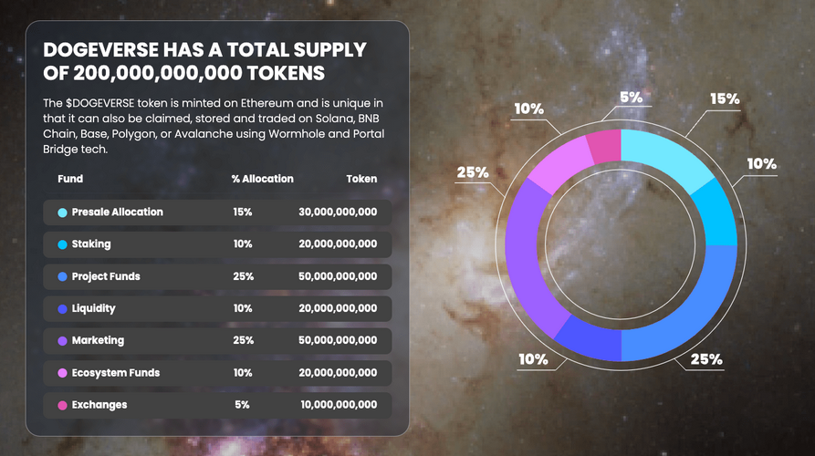Anche la tokenomica di Dogeverse è allettante. Dei 200 milioni di fornitura, il 15% è stato destinato alla prevendita in corso.
