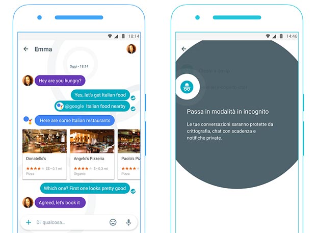Il vero cuore pulsante dell’app è però rappresentato dall’Assistente Google, una IA sempre pronta a fornire informazioni di ogni tipo. Per chiamarla in causa è sufficiente digitare “@google”. Che si tratti di trovare un’indirizzo, cercare un ristorante o condividere un filmato, non sarà più necessario abbandonare l’interfaccia di Allo.