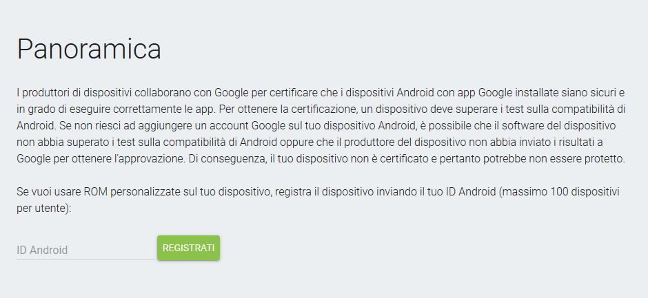 In questa pagina è possibile registrare fino ad un massimo di 100 dispositivi, inserendo il corrispondente ID Android. Per alcuni device viene accettato il codice IMEI, mentre per altri è necessario digitare il Google Play Service Framework ID (GSF). La sequenza numerica può essere trovata con l’app Device ID disponibile sul Google Play Store o sul sito APKMirror.