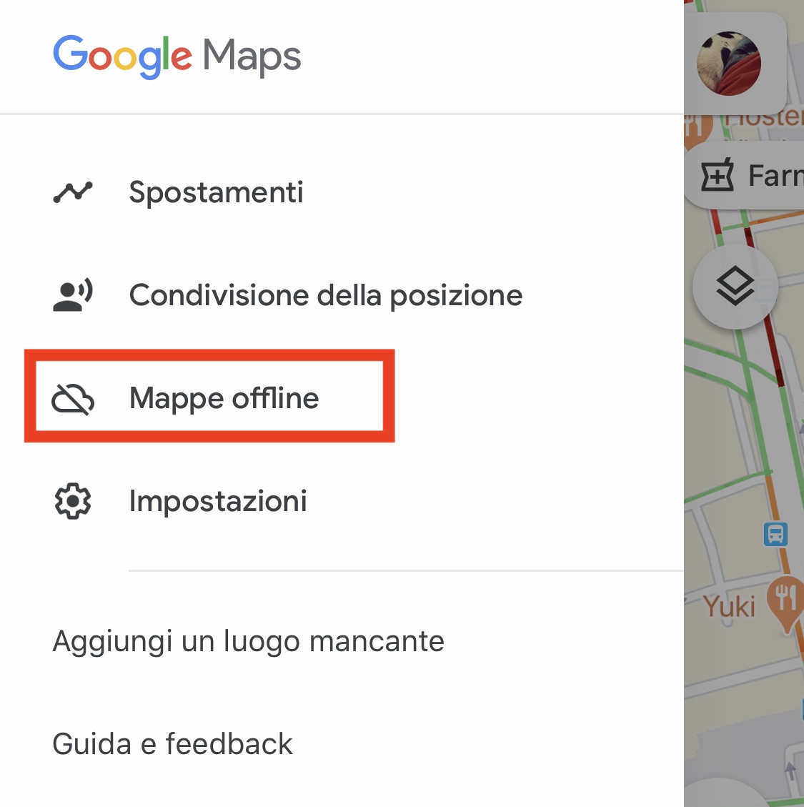 - Accedete al menu dell’app e selezionate Mappe offline